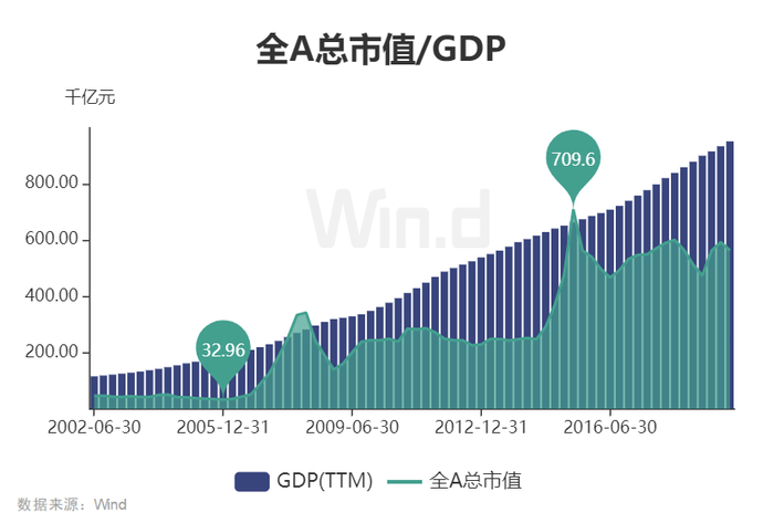 通过比较万得全A总市值、走势和GDP的关系,可以看到A股在2002年年后的两次大牛市行情顶部,万得全A指数均超过当时GDP总值(07年为140%,15年为100%),侧面反映了市场的估值水平。截止2019年四季度,万得全A指数总市值占GDP比重约为60%,而历史最低点仅为20%左右。