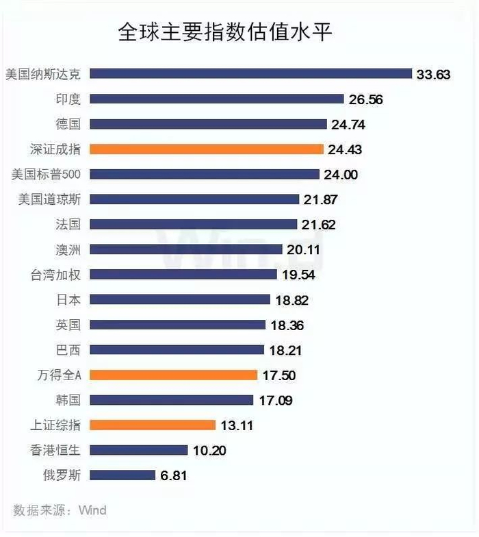 经过2019年全球股票市场的普涨,全球重要市场的估值水平都显著上升,主要欧美发达国家经济体的市盈率都在20以上,同期万得全A的市盈率(17.50)仅高于恒生指数、韩国综指以及俄罗斯RTS指数。