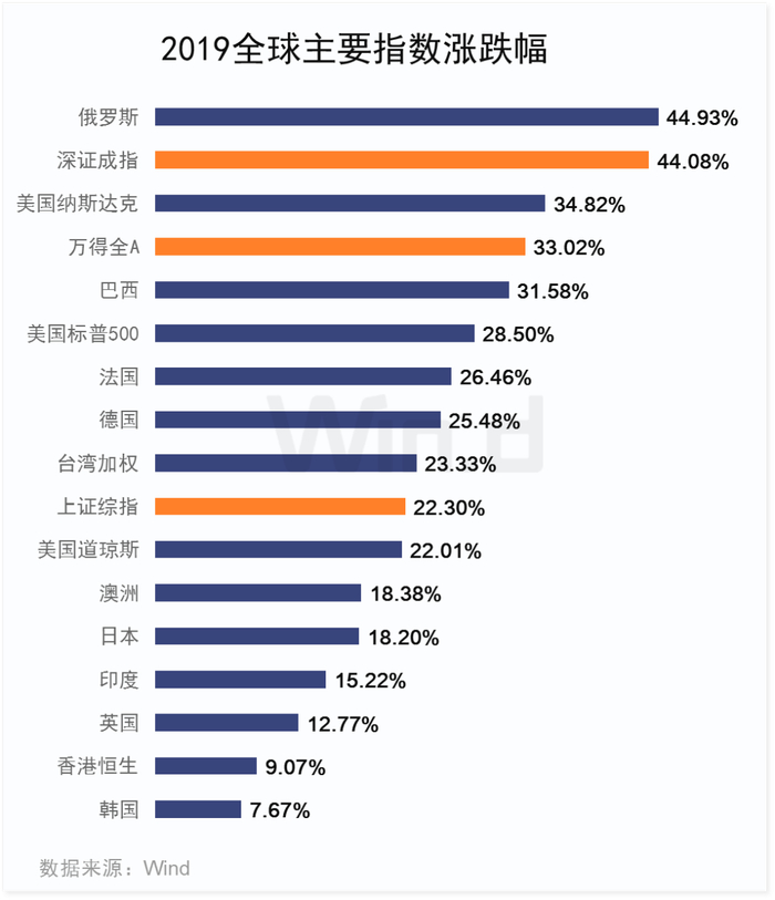 放眼全球股市,2019年A股可谓风光无限,深证综指以44.08%涨幅,位居全球主要指数涨幅榜第二位,涨幅仅次于俄罗斯RTS指数,上证综指22.30%的涨幅也达到了全球平均水平。