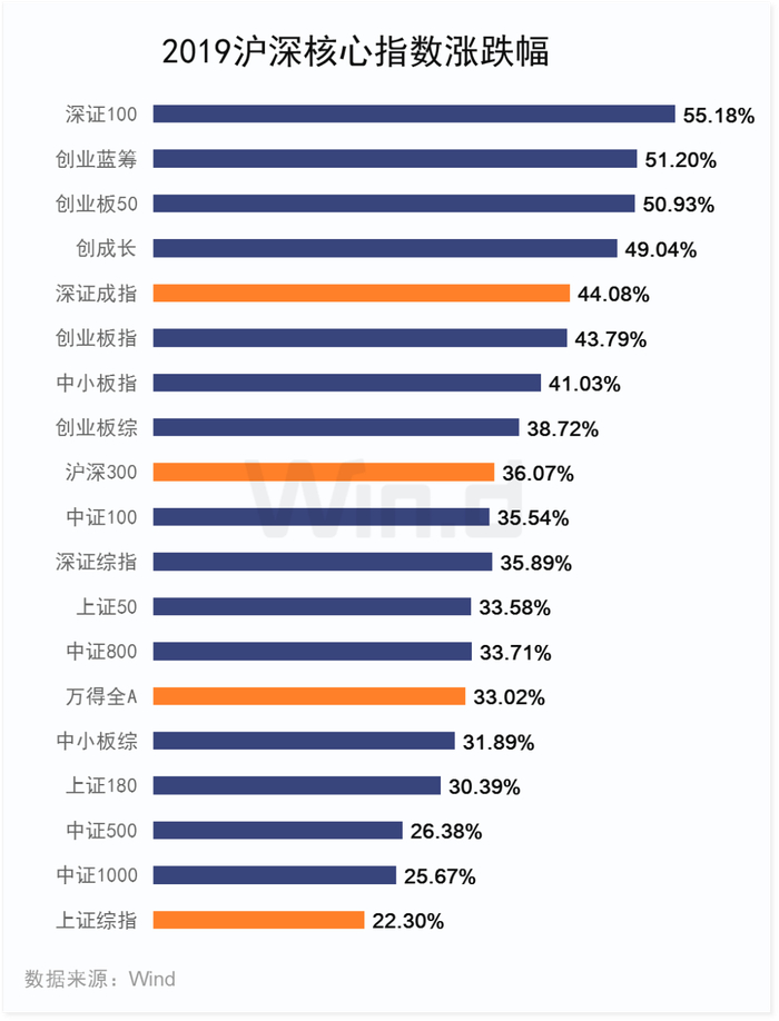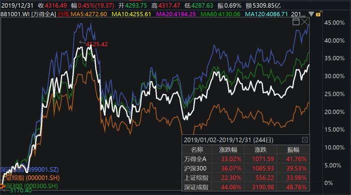 2019年全年深证成指以44.08%收官,而上证综指全年涨幅22.30%,万得全A指数涨幅33.02%。