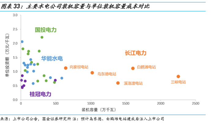单位装机容量成本中等偏低,成本优势显著:水电站初始投资金额与各水电站所处自然条件、地理环境密切相关,建设难度过大、开发成本过高的水力资源,即使满足技术可开发条件,依然有可能不具备经济可开发性。主要上市水电公司单位投资成本多在0.5-2.0万元/千瓦范围内,加权平均值0.95万元/千瓦,中位数1.02万元/千瓦。公司主要电站单位装机容量成本0.90万元/千瓦,可比公司国投电力、华能水电、桂冠电力单位装机容量成本分别为1.16、0.95、0.68万元/千瓦。公司装机容量显著超过可比上市公司,单位装机容量成本在可比上市公司中处于中等偏低位置,成本优势较为显著。