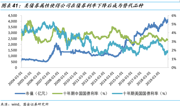 公司类债券属性在美债收益率下滑期间尤具竞争优势:公司稳定且高额的分红加上优秀的信用评级,让公司股票具备了一定债券性质,成为“类债券”资产。2018 年下半年以来,降息预期导致美债收益率下滑,美国十年期国债利率大幅走低,公司远超同行的股息率非常具有竞争力,公司市值再次走高。