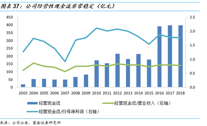 “打包”注入方式稳定现金流,公司经营能力优秀:公司有力的收入保障和有效的成本控制,为经营现金流的稳定打下基础。2003-2012年之间,公司三峡电站机组次第投产,其中2009年1270万千瓦装机容量投产帮助经营性现金流大幅提高,但2003-2007年560万千瓦、2011-2012年420万千瓦分批投产,使得公司经营性现金流在这些年份内不可避免出现波动。2016年,公司对溪洛渡、向家坝电站采取了在电站投产运行稳定后,再“打包”装入上市公司体内的扩张方式,在现金流大幅提高的同时,实现波动幅度大幅降低,体现出公司优秀的经营运作能力。