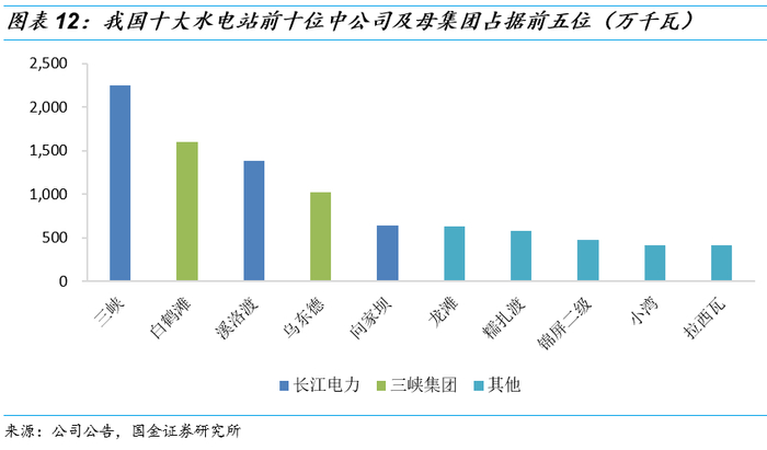 公司及第一大股东包揽我国十大水电站前五位:按照装机容量排序,我国十大水电站前十位中,长江电力所有的三峡、溪洛渡、向家坝水电站分别位居第一、三、五位;母公司三峡集团所有的白鹤滩和乌东德电站正在建设中,建成后将分别位居第二、四位。目前我国十大水电站前五位由长江电力及其第一股东三峡集团所有,若未来白鹤滩和乌东德电站资产注入上市公司,将进一步巩固公司全国水电龙头地位。