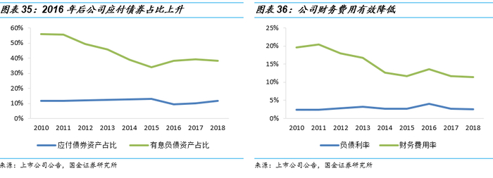 发挥融资成本优势,有效降低财务费用:公司拥有国内 AAA 级和国际主权级的信用评级,在国内外资本市场信誉良好,融资成本明显低于同期银行利率。2016-2019年之间公司发行不同期限债券共计670亿元规模,期间公司有息负债占总资产比例基本持平,应付债券占总资产比例持续上升。通过低成本的融资方式,公司负债利率不断下降,有效降低公司财务费用。