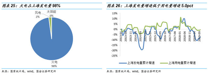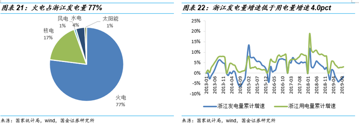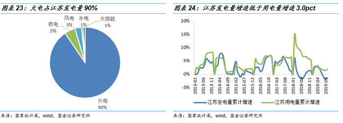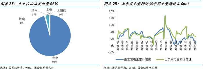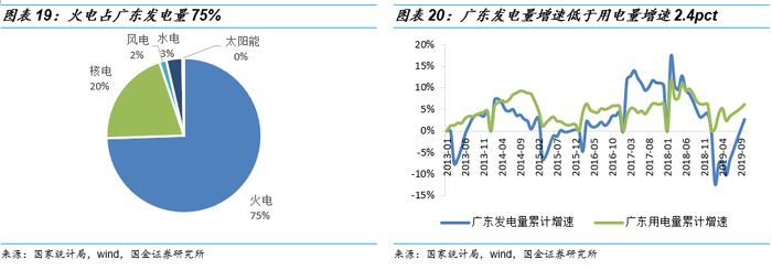 粤苏浙沪鲁五省(市)火电均占绝对主力,能源双控拖累发电增长:2018年下半年广东、华东区域各省开始实施能源“双控”政策(控制煤炭消费总量,控制煤炭质量),大力推动清洁能源发电。粤、苏、浙、沪、鲁五省火电发电量都占较大比例,受此影响,各省本地发电量从2018年下半年出现了不同程度下滑,并在2019年一度出现负增长。除广东由于有核电新机组投产,2019年下半年发电量增速转正,但依然低于用电量增速。