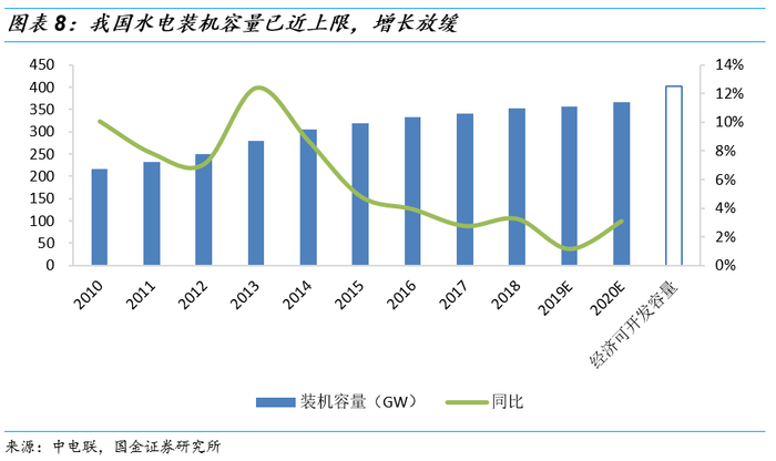 水电装机容量接近上限,远期经济可开发空间3454万千瓦:我国经济可开发水力资源约40180万千瓦,截至2018年年底已开发35226万千瓦,接近经济可开发水力资源上限。考虑到2019新投产的400万千瓦和2020年将投产的1100万千瓦水电装机容量,未来远期开发空间约3454万千瓦,增长空间非常有限。