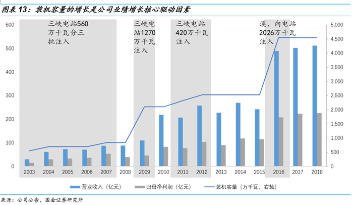 2009年,公司收购三峡电站9号-26号共计18台机组共计1270万千瓦,2011、2012年,三峡电站扩建的27号-32号共计6台机组420万千瓦陆续投产,公司装机容量达到2527.7万千瓦,相比三峡电站注入之前提升202%,同期公司营业收入增长193%,归母净利润增长163%。