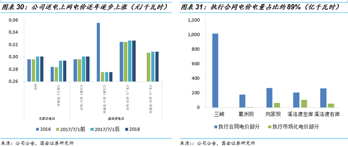 执行合同电价部分上网电量占比89%,合同电价稳定保障收入:公司主要送电的华东和广东区域整体供需格局良好,外送电需求持续扩大,公司送电上网电价近年稳中微升。葛洲坝和三峡电站合同上网电价常年维持不变,向家坝和溪洛渡电站合同上网电价2018年相比2016年均有1-8厘/千瓦时的小幅上升。根据2018年公司上网电量情况,我们估算公司上网电量执行合同电价部分约占总上网电量比例89.5%,稳中微升的合同上网电价保障了公司未来收入,预计未来电价将继续维持现有水平。除此之外市场化交易电价虽有升有降,但执行市场化电价部分上网电量占比仅10.5%,对公司收入影响甚微。
