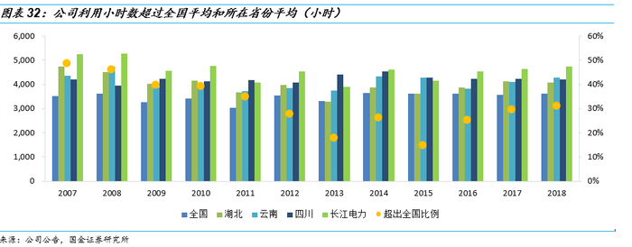 公司装机容量、发电量居全国水电企业首位:2018年公司水电装机容量4549.5 万千瓦,占全国水电装机容量的12.9%;水电发电量2154.8亿千瓦时,占全国当年水电发电量19.5%。无论装机容量和发电量角度,公司都居于全国水电企业首位,稀缺性进一步提升。公司水电发电量全国占比显著高于其装机容量全国占比,资产质量显著高于行业平均水平。