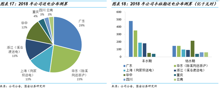 公司上网电量主要在华东、广东消纳:公司上网电量主要送往广东、华东(三峡、葛洲坝电站送电)、上海(向家坝电站送电)、浙江(溪洛渡电站送电)等区域。若将向家坝送电上海、溪洛渡送电浙江部分计入,公司在华东区域总计消纳50%左右上网电量。在丰水期,公司大部分电量送往广东和华东地区;在枯水期,公司电量送往广东、上海、浙江、华东、华中等区域,华中区域送电最多。
