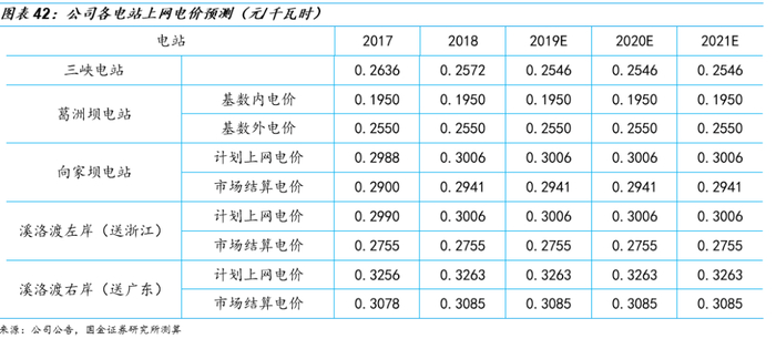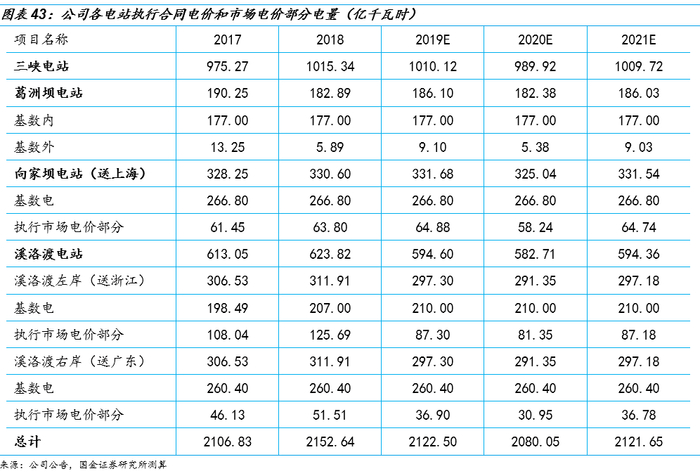 葛洲坝、向家坝、溪洛渡右岸往年执行合同电价部分电量基本稳定,预计未来继续维持历史合同电量;溪洛渡左岸往年执行合同电价部分电量在198-215亿千瓦时之间波动,取中间值预计2020-2021年执行合同电价部分电量为210亿千瓦时。
