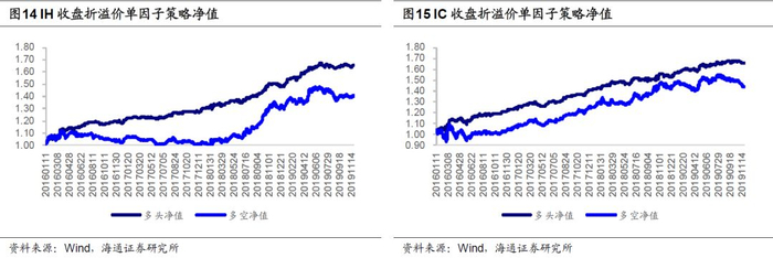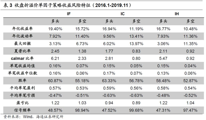 收盘折溢价单因子策略表现如以下图表所示,其中IF多头策略年化收益率19.40%,平均单笔收益0.16%;多空策略年化收益率15.72%,平均单笔收益0.07%。由于隔夜收益本身显著为正,因此多头策略表现好于多空策略。