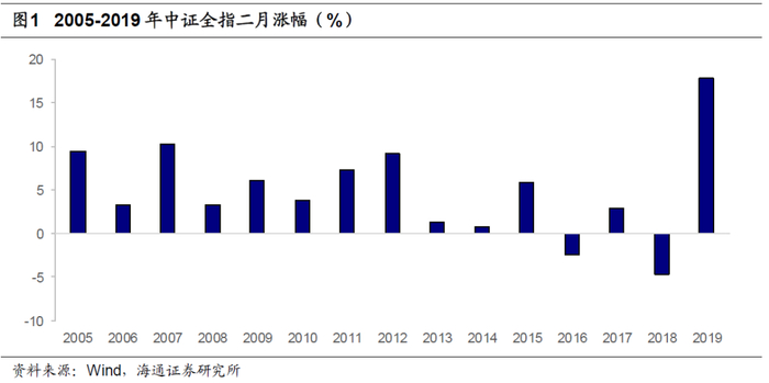 A股市场存在明显的日历效应,在2月和春节前后上涨概率较大。2005-2019年,中证全指在2月的上涨概率高达87%,涨幅均值和中位数分别为4.94%和3.83%。