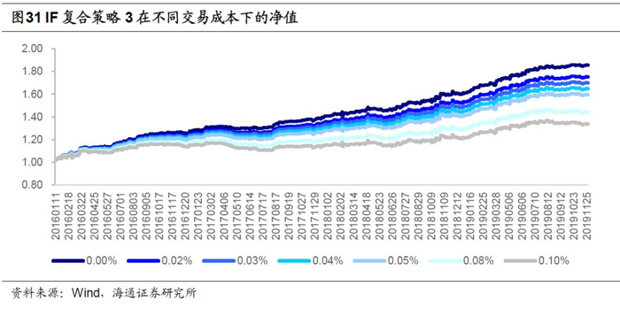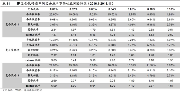 以IF为例,复合策略在不同交易成本下的表现如以下图表所示,其中策略1对交易成本的敏感性最高,策略2的敏感性最低。在双边万分之3的交易成本下,复合策略1-3的年化收益率分别为17.29%、10.47%和18.02%,夏普比率分别为1.79、1.81和2.21。由于目前股指期货开仓和隔夜平仓手续费仅为成交金额的万分之0.23,策略具有较高的收益空间。