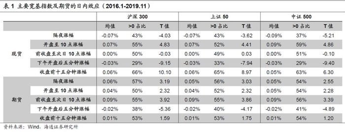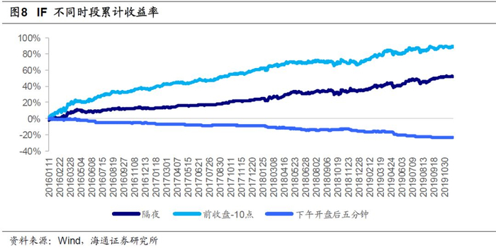 以沪深300指数为例,2016年以来,其隔夜涨幅均值为-0.073%,T值为-4.03;开盘后至上午10点涨幅均值为0.073%,T值为4.83,均统计显著。此外,下午开盘后五分钟下跌概率高达70.6%,T值为-9.15,但涨幅均值仅为-0.028%。临近收盘,指数再度走强,收盘前15分钟上涨概率为65.7%,涨幅均值为0.059%,T值高达10.1。与指数相比,股指期货在早盘和尾盘的收益表现差异明显。IF隔夜涨幅均值为0.055%,T值为3.19。收盘前15分钟上涨概率为53.3%,涨幅均值为0.011%,T值仅为1.59,统计不显著。