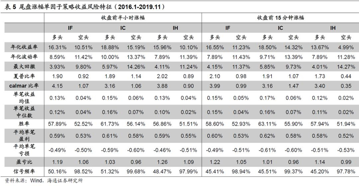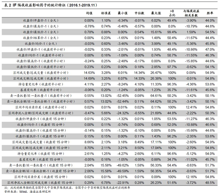 以IF为例,主要因子的统计特征和对隔夜收益的影响如下表所示,我们下文将选取收盘折溢价、买卖单不平衡度、基差变化率等预测效果相对较好的因子作进一步分析。