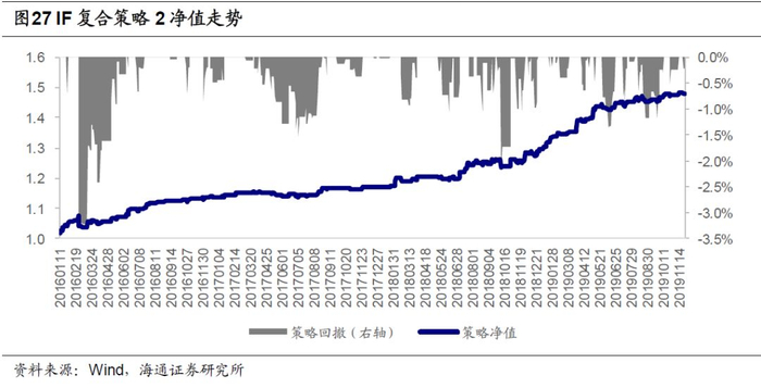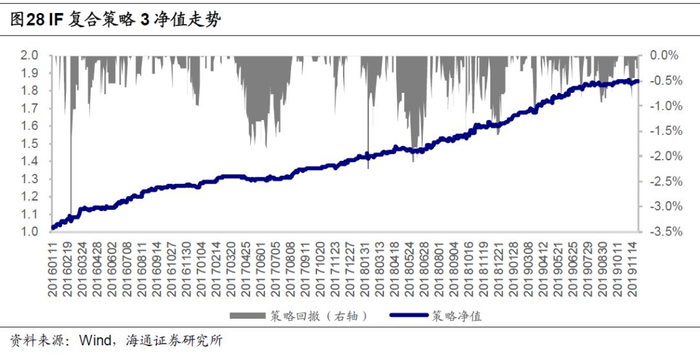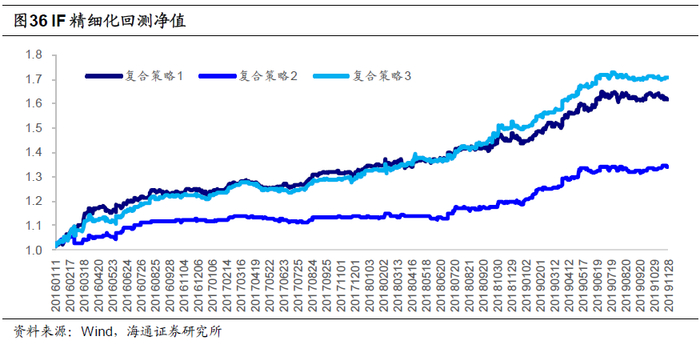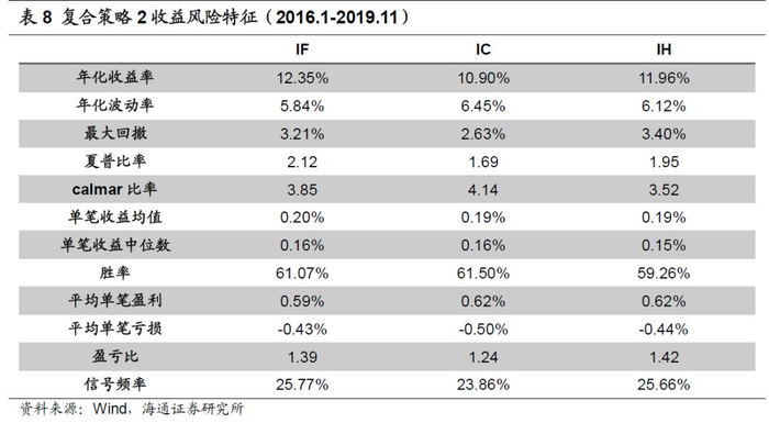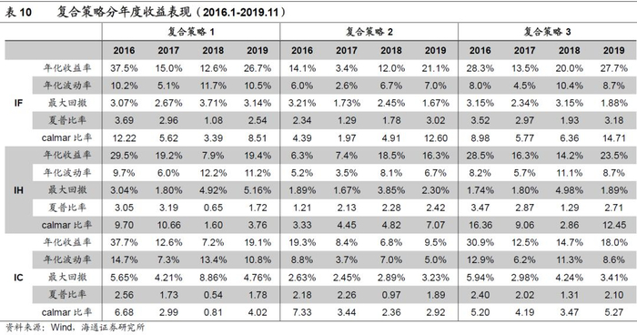 复合策略分年度表现如下表所示,其中策略3表现相对均衡,在IF、IH、IC三个品种上每年收益率均超过10%。