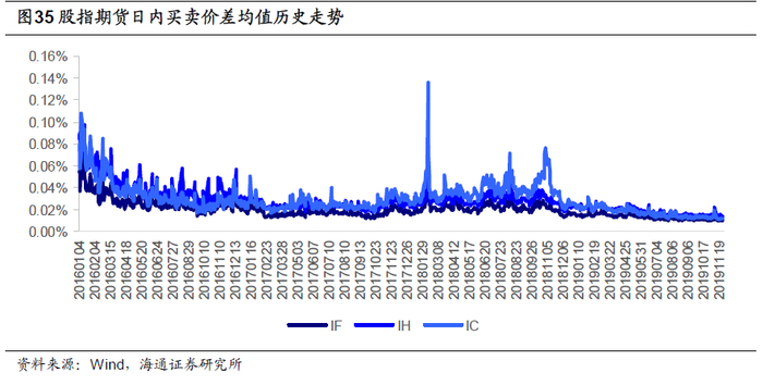 股指期货日内买卖价差均值的历史走势如下图所示,IF、IH、IC的价差均值分别为0.02%、0.029%和0.03%。近一年来,股指期货流动性提升,买卖价差持续收窄,有利于策略的开展。