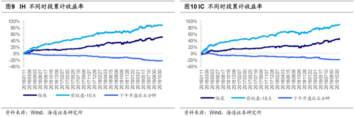IF、IH、IC在隔夜、前收盘至次日上午10点、下午开盘后五分钟三个不同时段的区间累计收益率如下图所示,其中前收盘至次日上午10点的平均收益率分别为0.093%、0.092%和0.095%,年化收益率分别为22.80%、22.41%和23.14%。