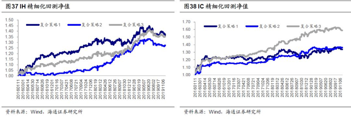 复合策略在精细化回测框架下的表现如以下图表所示,其中策略3表现最好,IF、IH、IC的年化收益率分别为18.19%、9.04%和15.15%,夏普比率分别为2.18、1.03和1.52。