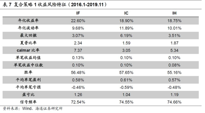 IF复合策略1的年化收益率为22.60%,夏普比率为2.34,calmar比率为7.37,平均单笔收益为0.13%,信号频率为72.54%。