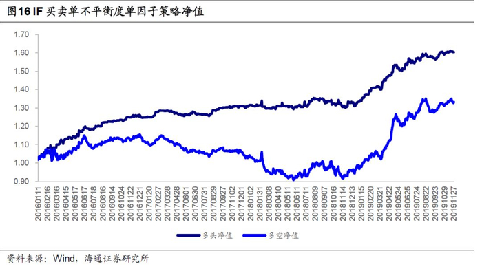 买卖单不平衡度单因子策略表现如以下图表所示,其中IF多头策略年化收益率15.55%,平均单笔收益0.13%;多空策略年化收益率8.55%,平均单笔收益仅为0.04%,多头策略表现同样好于多空策略。