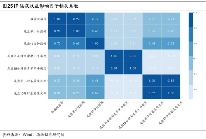 以IF为例,隔夜收益影响因子的相关系数矩阵如下图所示。可以发现,同一大类因子之间相关性较高,例如收盘折溢价因子与收盘前半小时涨幅因子相关系数高达0.9。而不同大类因子间相关性较低,例如收盘折溢价因子与收盘前半小时买卖单不平衡度因子之间相关系数仅为0.09。