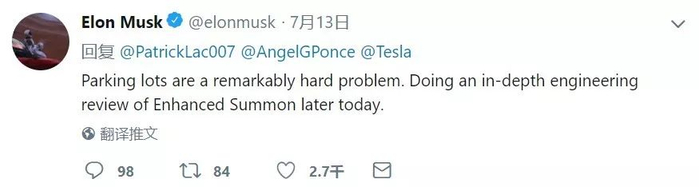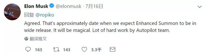 三天后答另一位网友的问题时,Elon 透露「增强召唤」将于 8 月 16 日前后进行大规模推送。Autopilot 团队攻克了大量复杂的挑战。对于新版增强召唤,Elon 的评价是 Magical。