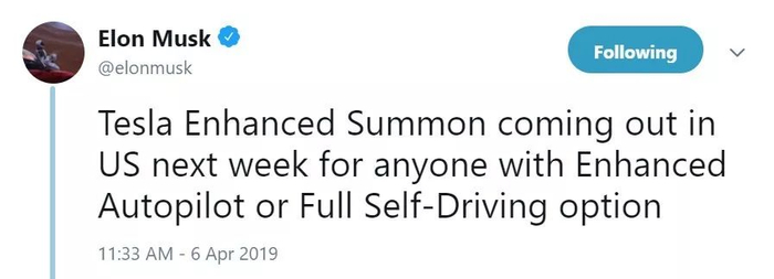 2019 年 4 月 6 日,Elon Musk 在 Twitter 预告「增强召唤」将于一周后大规模推送。但随后 Autopilot 的实际表现证明,那个版本的「增强召唤」完全没有 Elon 说得那么效果拔群。