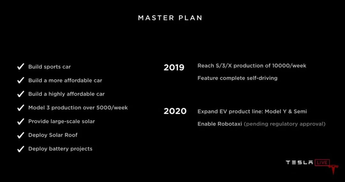 在特斯拉投资者日上,Elon 放出了一张特斯拉的十年 To-do List,左边是已经达成的里程碑,右边明确写着 2019 年,也就是未来 5 个月内,特斯拉将实现自动驾驶功能完成(Feature complete)。