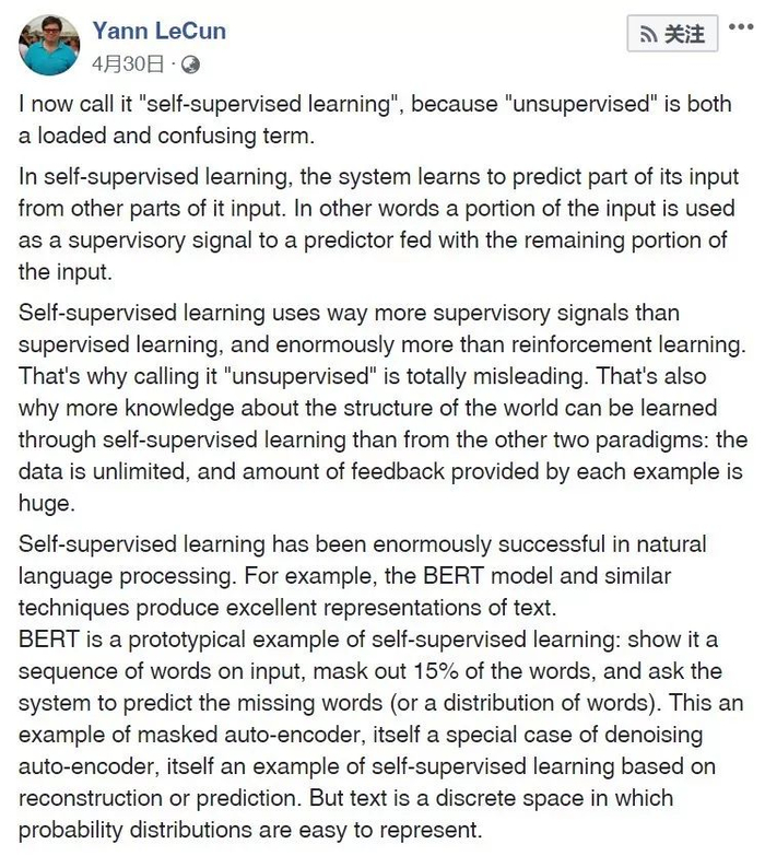 自我监督学习是深度学习领域非常热门的一个细分方向,4 月 30 日,三大 AI 教父之一、Facebook 首席 AI 科学家 Yann LeCun 专门发文谈了自我监督学习领域的现状。自我监督学习在自然语言处理领域取得了巨大的成功,但在图像或视频领域还不能很好的工作,在他看来,这将是未来几年 AI 领域最棘手的挑战(the greatest challenge in ML and AI of the next few years)。