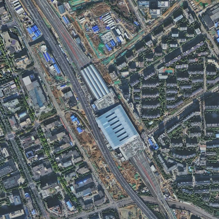 ▲卫星中可见的“小蓝顶”老站房被平移到新站房。图片来源:中国铁路