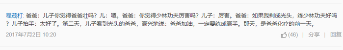 儿子看到光头的爸爸,高兴地说:爸爸加油,一定要练成高手。