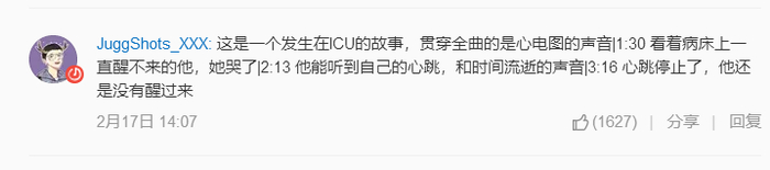 “这是一个发生在ICU的故事,贯穿全曲的是心电图的声音|1:30 看着病床上一直醒不来的他,她哭了|2:13 他能听到自己的心跳,和时间流逝的声音|3:16 心跳停止了,他还是没有醒过来。”
