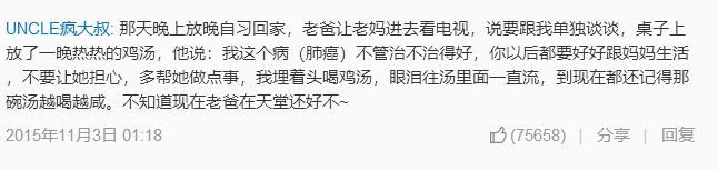“那天晚上放晚自习回家,老爸让老妈进去看电视,说要跟我单独谈谈,桌子上放了一晚热热的鸡汤,他说:我这个病(肺癌)不管治不治得好,你以后都要好好跟妈妈生活,不要让她担心,多帮她做点事,我埋着头喝鸡汤,眼泪往汤里面一直流,到现在都还记得那碗汤越喝越咸。不知道现在老爸在天堂还好不~”