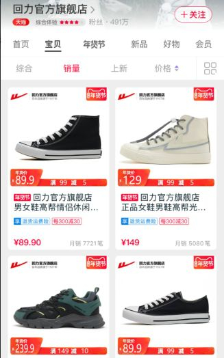 在回力官方旗舰店可看到,店铺内销量最高的一款高帮运动帆布鞋月销量已超过7千双;而其他几件爆款单品的月销量也超过了5000双。据天猫数据,2019年“双11”当天,该店的销售额跻身鞋类销售排行榜,在百丽、斯凯奇、骆驼等品牌后居第五位。