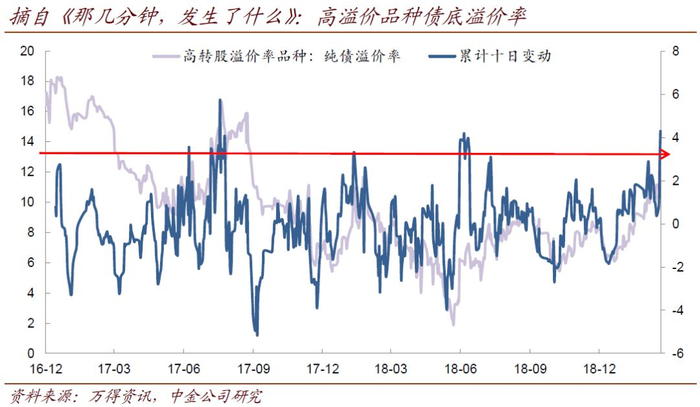 “虽然一些主要指数调整,但今年年末至明年年初的一段时间仍是值得期待的一段增持窗口”——2018年的最后一期周报,我们给了这样的判断。虽然事后来看,投资者的印象是转债市场在整个一季度乃至二季度的前半段表现都是不错的,但其实过程要比想象中曲折一些,主要在2点上:1、虽然数据上看2014年上半年平均隐含波动率更低,但上市就出负溢价的2018年末还是让投资者不禁疑惑:是不是估值的下限变了,以及是不是就变不回去了;2、一月下旬,创业板的回调也令人怀疑,是不是这又只是个反弹而已。对于第一点,也就是关于估值的中枢,我们在去年的回顾报告《请回答2018》里提到一个说法:“转债还是个小市场吗?——是”。这里稍作延伸,无论再如何发展壮大,这个如今200多支个券、5000亿市值的市场,在整个国民理财体系里,都太小了。于是“供求”是一个表面上有意义,但实际作用被远远高估的一个分析视角。此前我们也论述过,只有供求进入十分极致的状态时(比如2015年下半年),这个因素才会成为主导因素——而且知道了这一点,也对当时的投资没有多大帮助,因为当时的转债对刚需者以外的投资者毫无意义。而多数情况下,“需求”是个虚数——涨的时候,需求无穷无尽,跌的时候,需求无从谈起。从卖方的角度观测实际更为真切,这就是这个市场的现实。很快,投资者开始不适应的是快速上涨的环境。风险意识只是一方面,让经历过2016、17、18这三年的投资者,突然在新年的前16个交易日就拿到接近3.8%的指数涨幅,也确实有不适应感。在1月23日的周报中,我们给出了几种监控行情(何时结束)的方法(1月20日《聊几个数据,兼论个券下车技术》),其中就包括后来提到多次的高转股溢价率品种债底溢价率(卖点何时到来)、以及Easy Ball数量(买入窗口何时关闭)——但无论哪个角度看,这个时候,行情都没结束。不过,很快,市场迎来了一个很关键的节点:2019年的第一个大盘、低中签率转债——平银转债,要在2月18日上市了。彼时,市场关注的重心似乎在其上市定位上,但我们提示了一个反馈机制出现的可能(《如果捅破那层窗户纸,那道咒语又要响起》),“以下是重点:市场本来还担心供给、也期待供给,毕竟市场许久未见大盘转债。但当平银上市,如果很快出现一个令人略感绝望的价格,那一层窗户纸可能就要被捅破了。接着,如同一道咒语响起,市场热情被点燃,一切在投资范围内、价格还不太高的品种都会变得眉清目秀。然后,机会就结束了”。后来这个预演成真,转债市场估值发起冲刺:2月24日,我们的周报名为《炼狱模式:从“easy ball”到“logo shot”》,意味着我们认为转债传统买点已经关闭。不过,有意思的是,看过这篇报告的投资者似乎对“logo shot”等这些来自篮球的术语更感兴趣。我们在此简单解释,转债和运动有很多共通点,其中最主要的,是都讲求产量与效率的结合,或者说最优化。比如对于转债来说,考虑收益和回撤,“easy ball”(概念最早见1月13日周报)是一个有逻辑也有数据能够证明的高效方法,很接近上空篮——但这样的机会不是随时都有,就像球场上的对手也不会放任对方上一场的空篮,这里就有了效率和产量的矛盾。于是,投资者必须开发其他效率不够高但能够撑下持仓的机会,这也是为何往往明星球员命中率并不突出(当然也有例外),因为他们要负责消化那些不太容易的出手。在转债市场上,这样理解起来其实清晰明了,如果高效的机会够多,就把持仓更多地交给省时省力的easy ball,当难度提高时,就要考验投资者原地开发机会的能力了:比如,当beta也很不错时,靠大票消化持仓;当趋势度很强时,可以尝试高绝对价位品种;以及,我们近期也提示适当做一些短周期的行业轮动(见上周周报《明知无能为力,但还要尽力争取》)。这一段真正的转折点,我们认为是3月初。在3月10日《那几分钟,发生了什么》中,我们提示了一些问题。其中一些,是在分钟级别下的一些观察,当然不少投资者并不愿意看太短线的分析——即使,市场的大转折,其实也可以精确到分钟级别,只是做到并不容易。但我们也引申了两个结论:1、券商基本确定要在这个节点上交出“领涨”这个地位,如果后面没有其他版块能接过这个重任,市场的趋势就会开始弱化;2、easy ball完全消失,而高转股溢价率品种债底溢价率这个指标,已经触及红线。当然,市场没有在当时立即见顶,只是冲高变得更难了,后来市场在4月8日触及阶段高点,迎来一段调整期。