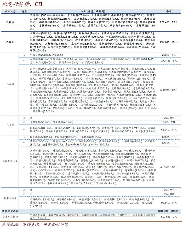 转债/公募EB一级市场跟踪 本周新公告了1个转债预案,为运达股份(5.77亿元);证监会新受理3个转债预案,为航新科技(2.5亿元)、法兰泰克(3.3亿元)、紫金银行(45亿元);9个方案过会,为盛屯矿业(23.86亿元)、凌钢股份(4.4亿元)、联创电子(3亿元)、海大集团(28.3亿元)、天铁股份(3.99亿元)、红相股份(5.85亿元)、华体科技(2.09亿元)、华安证券(28亿元)、龙净环保(20亿元);星帅尔(2.8亿元)、康弘药业(16.3亿元)、宏辉果蔬(3.32亿元)拿到核准批文。目前核准待发个券共20只820.4亿元,已过会未核准个券共26只297.5亿元。