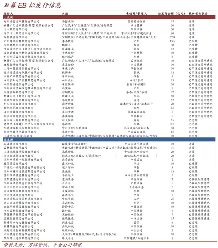 私募EB信息追踪 本周有3个新受理私募EB预案:1)上海电气(集团)总公司,正股可能为上海电气,规模50亿元,主承为国泰君安证券/瑞信方正/中信证券;2)中兵投资管理有限责任公司,正股不明,规模10亿元,主承为中信证券;3)陕西烽火通信集团有限公司,正股可能为烽火电子,规模6亿元,主承为中信建投/海通证券。2个私募EB获通过。