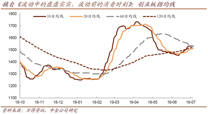 实际上,相比年初而言,我们认为这个时段更加充分地诠释着转债的特性:股市是转债第一大驱动力没错,但转债也拥有着和股票不尽相同甚至完全不同的买点和卖点。转债的估值反映着附着在股价之上的另一层预期(股价本身就有一层预期),而如何利用好这额外的一层,也基本决定了在2019年这样的行情下,能不能做出像样的效果来。波动前的消音时刻出现了——另有一个后来容易被忽略的事实是,创业板指当时的长、短均线出现了交织的情况,而且换手率也明显回收。在《波动中的虚虚实实,波动前的消音时刻》中,我们提示“结合起来,市场进入高度沉默的状态,而历史经验上,市场正在为下一次的波动做准备”——后来这一点兑现,只是没想到,年末出现了一次更大级别的均线交织(详见12月8日《总有机会藏在偏见里》)。