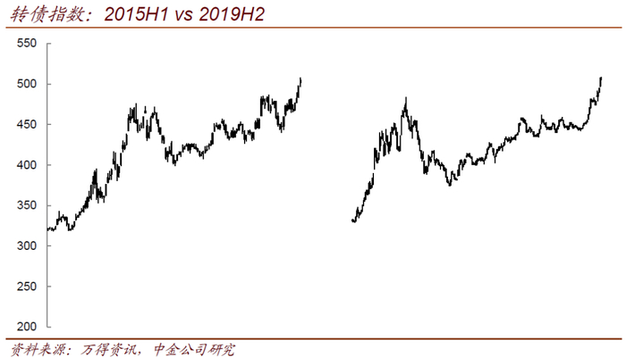 12月开始的这一段,性质已经和此前的两次不同——因为起点上,转债估值已经是中位(高资质品种高位)了。那么如果不像这两段,现在的情况更接近历史的哪一段?下面的两个分别是2015年上半年的转债指数以及2019年下半年,我们去掉了时间轴,投资者不妨一试,能够很快看出来哪个是2015哪个是2019吗?