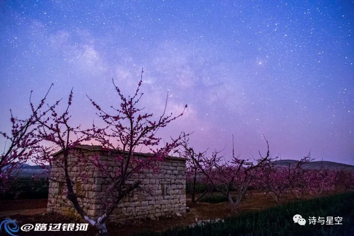 有年4月,清明节前,表哥连夜驱车去了一个盛产桃子的小村庄,当时正好桃花朵朵开。和大多数赏桃花的游客不同的是,表哥是半夜去的,拍下了壮丽的桃花银河。