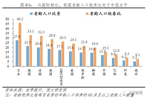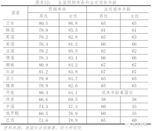 三是推迟法定退休年龄。从预期寿命看,我国与发达国家相比仍有一定差距,但在发展中国家中处于偏高水平。据美国社会保障署数据,2018年中国居民男性和女性的预期寿命分别是74.3和77.3岁,与日本的80.5和86.8仍有一定差距,但与俄罗斯、印度相比处于较高水平,这主要得益于我国逐步提高的居民生活水平和医疗卫生条件。从法定退休年龄看,中国退休年龄较低,男性法定退休年龄为60岁,低于日韩英美,也低于巴西,仅高于印度的58岁;女性退休年龄55岁,与俄罗斯的55岁持平,低于印度的58岁。综合来看,我国有延迟退休年龄的空间。