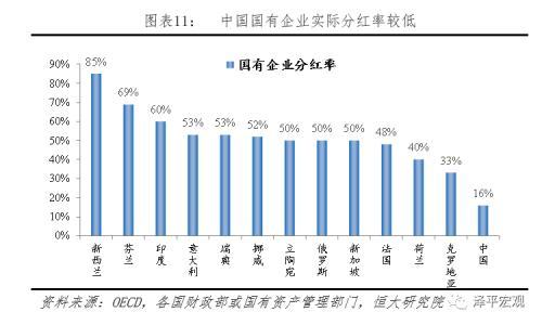 国资划转社保最乐观估计预计规模达6.7万亿元,实际补充养老金缺口仍需看分红比例。据国务院2017年《划转部分国有资本充实社保基金实施方案》,国有资本划转对象为中央和地方国有及国有控股大中型企业、金融机构,划转比例统一为企业国有股权的10%。2017年末我国国有净资本87万亿元,扣除行政事业单位的20.5万亿元,国企净资本为66.5万亿元,则可划转金额约为6.7万亿元。2019年9月末,财政部数据显示已有67家央企和中央金融机构完成部分国有资本充实社保基金,共划转资本总额8601亿元,则剩余待划转规模仍接近6万亿元。据财政部介绍,社保基金会在接收划转的国有资本后获取收益的方式是“分红为主,运作为辅”,则划转国有资本转化为基金收入仍取决于相关股权分红率。从国际比较来看,当前国有企业分红率较低。据OECD研究报告,2018年我国国有企业实际分红率16.1%,非金融国企仅为5.8%,远低于十八届三中全会提出的2020年达到30%的分红目标。同时,与新西兰(85%)、芬兰(69%)、印度(60%)、俄罗斯(50%)等国家相比处于低水平。