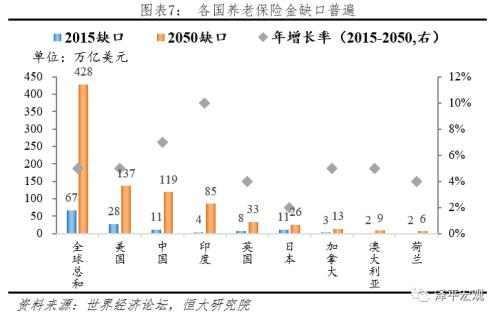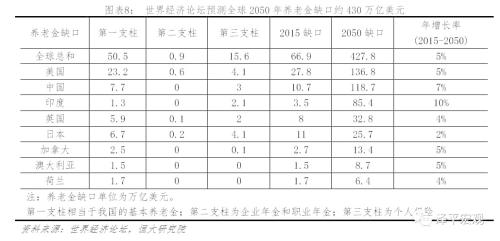 养老金缺口是世界共同面临的重要问题。2017年5月世界经济论坛发布了《我们都将活满百岁:怎么才能承担得起》的报告。报告指出,预计2050年全球养老金缺口将达到400万亿美元,美国、英国、日本、荷兰、加拿大和澳大利亚六个养老金储蓄型大国养老金缺口合计将高达224万亿美元,而400万亿美元中剩下的缺口则主要由中国和印度这两个人口大国承担。