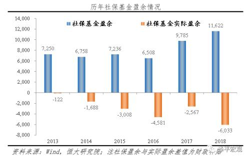 2018年社会保险基金当年缺口创新高,高度依赖财政补贴。据2018年社保基金决算,全国社会保险基金总收入79003亿元,比2017年增长35.2%;总支出67381亿元,比2017年增长38.5%;2018年收支结余11622亿元,较上年末增长18.8%;其中2018年财政补贴收入为17655亿元,剔除财政补贴后的实际盈余为-6033亿元。从财政补贴看,2018年财政补贴16777亿元,占社保基金收入的约21.2%。剔除财政补贴后的社保基金连年入不敷出,2013年的实际盈余为-121.84亿元,而2018年则达到了-6033亿元,社保支出严重依赖财政补贴的支撑。