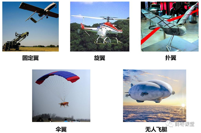 按飞行平台构型,可以分为固定翼无人机、旋翼无人机、扑翼无人机、伞翼无人机、无人飞艇。