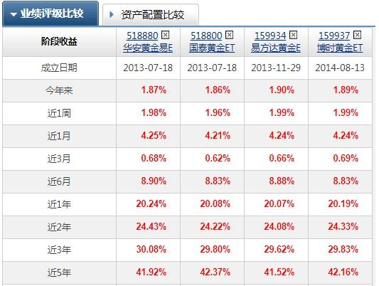 目前国内市场主要的黄金ETF有四只,即华安易富黄金ETF、国泰黄金ETF、易方达黄金ETF、博时黄金ETF,投资标的都是上海黄金交易所AU9999黄金现货合约,以人民币计价,跟踪国内金价变动。上述四只黄金ETF的管理费率和托管费率也一样,所以业绩表现相差不大。
