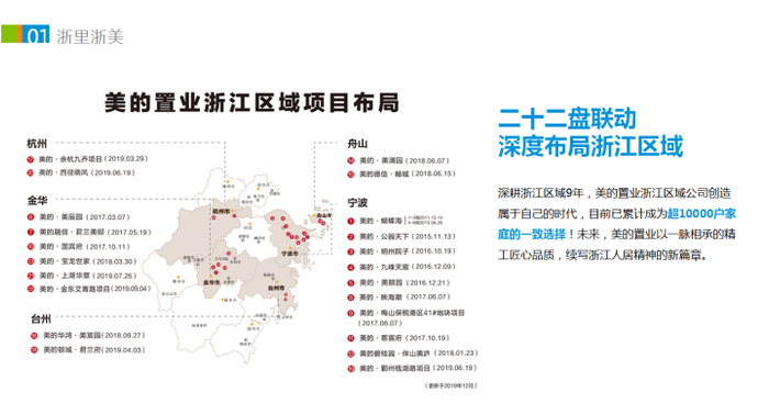 2011年,美的置业进入浙江省,首个项目美的蝴蝶海落子产业基础良好的宁波市,并逐步在当地扎根,迄今已布局10个项目。随后几年,美的置业先后进入浙江省金华、舟山、台州和杭州。
